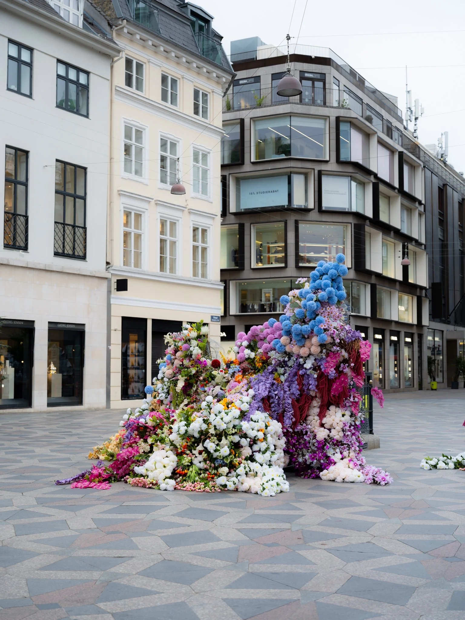 Located in the heart of Copenhagen, this large-scale floral installation was created by Tableau in collaboration with Botané. Composed of abundant, vividly colored blooms cascading across the city square, the work transforms the urban landscape into a living canvas of texture and movement.