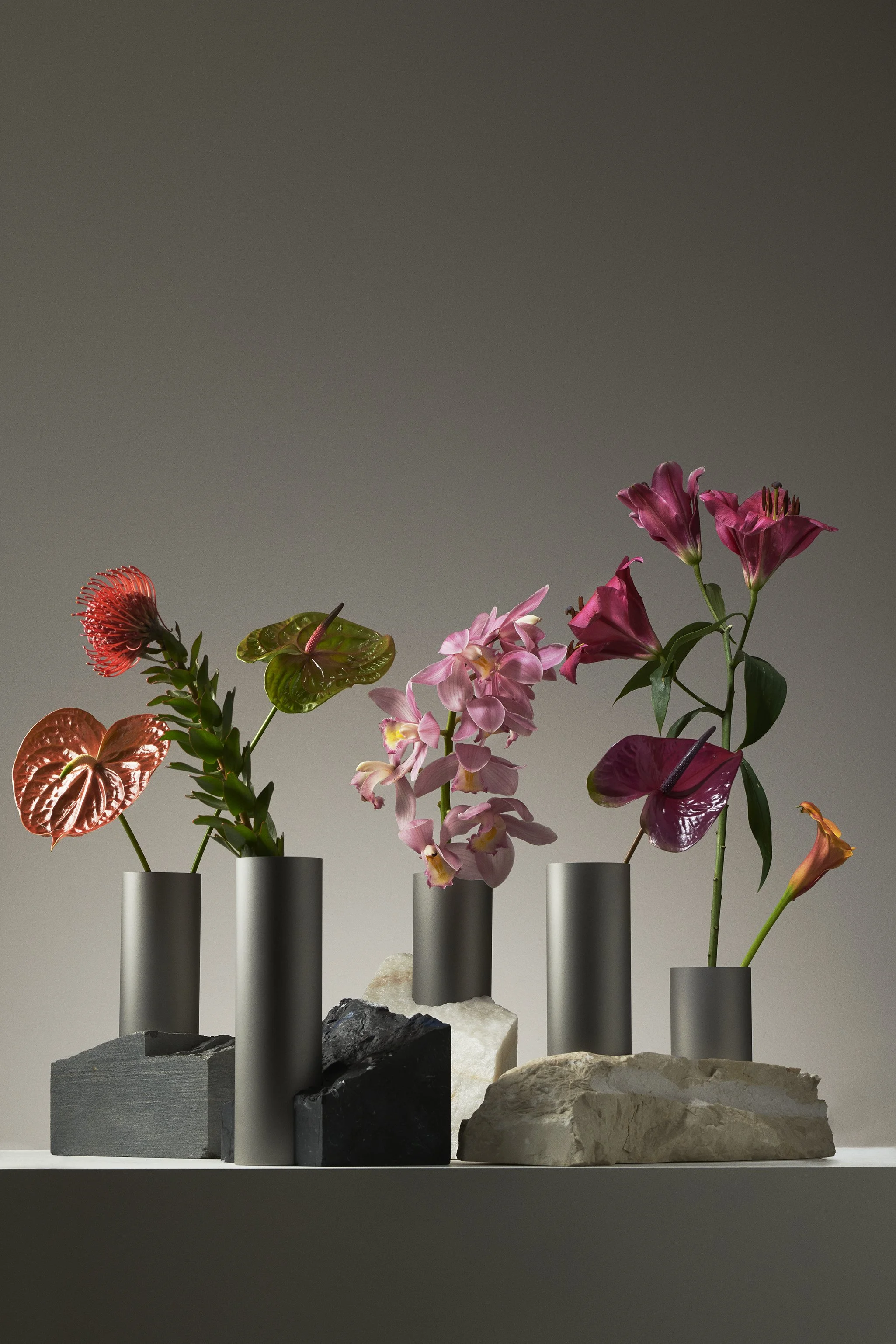 Within this collaboration, the traditional vase is reimagined as a sculptural “vessel” — an interplay of stone pedestals and steel pipes that merges raw materiality with refined design. Each piece is unique, celebrating nature’s most exquisite stones — marble, yellow onyx, Marquina, and Portugal pink — each distinguished by its own cut, color, and veining.
