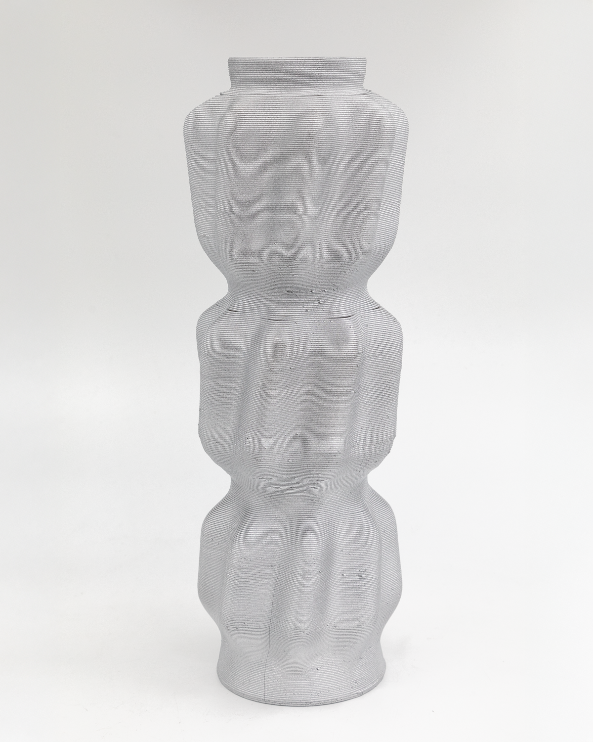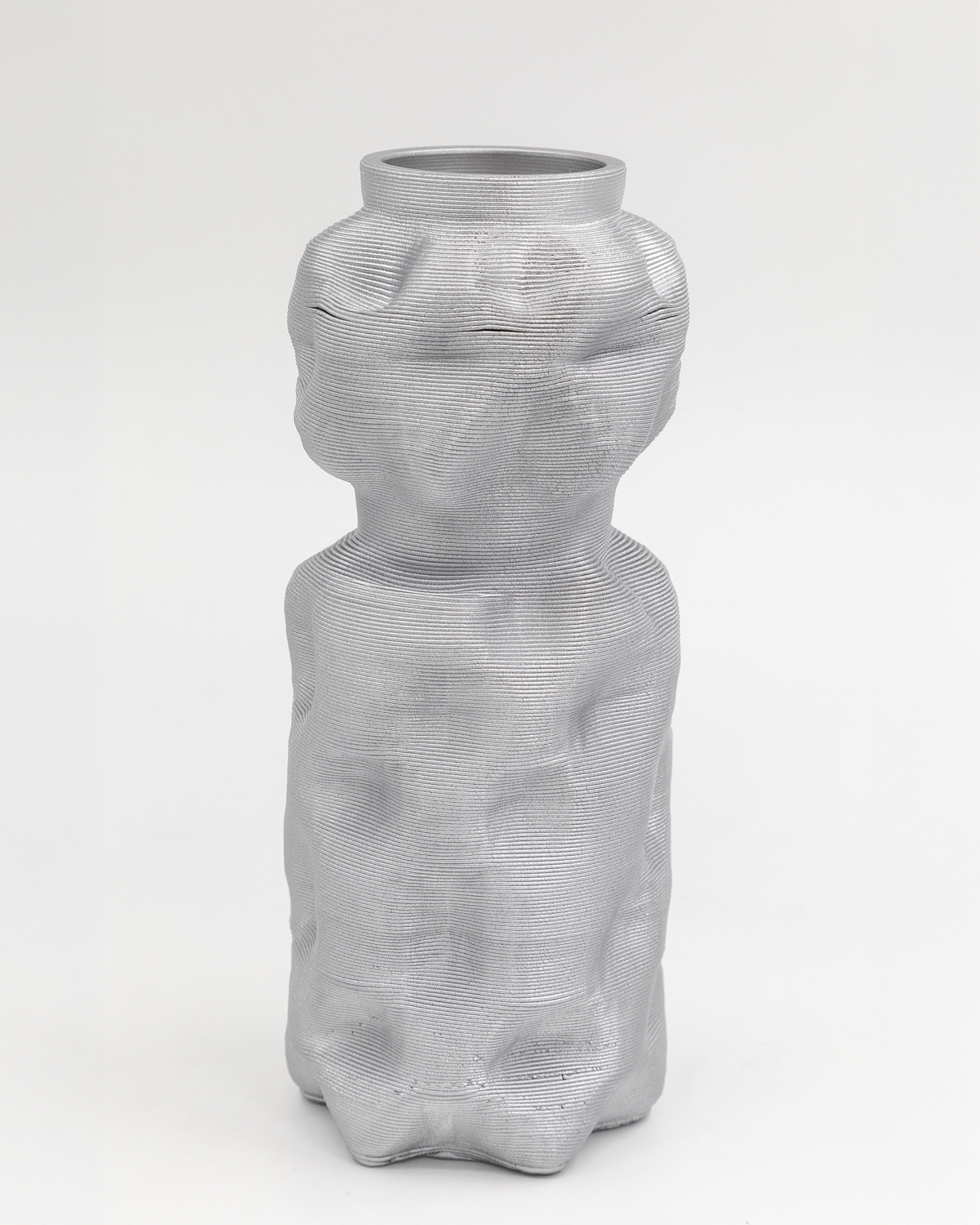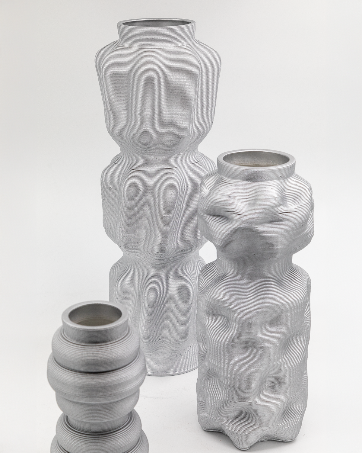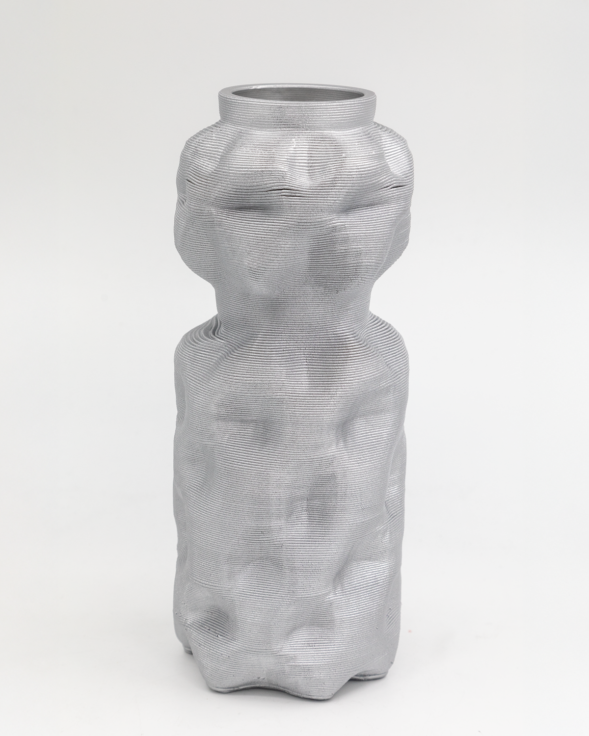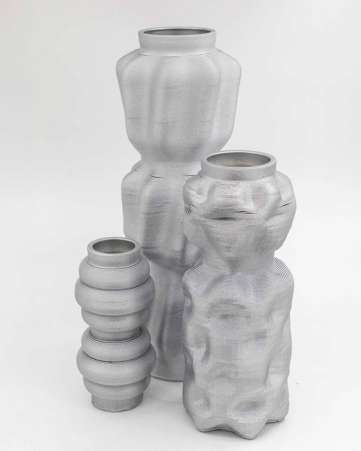 The vases are 3D printed in clay, fired and then spray coated with aluminium. Available in 3 sizes.
