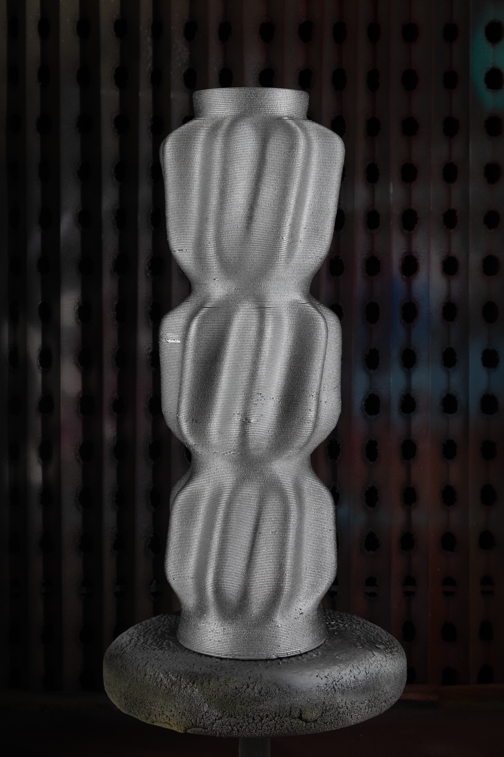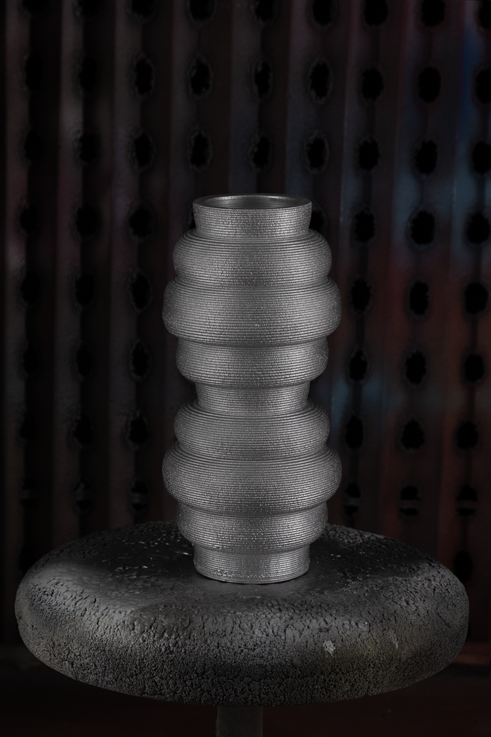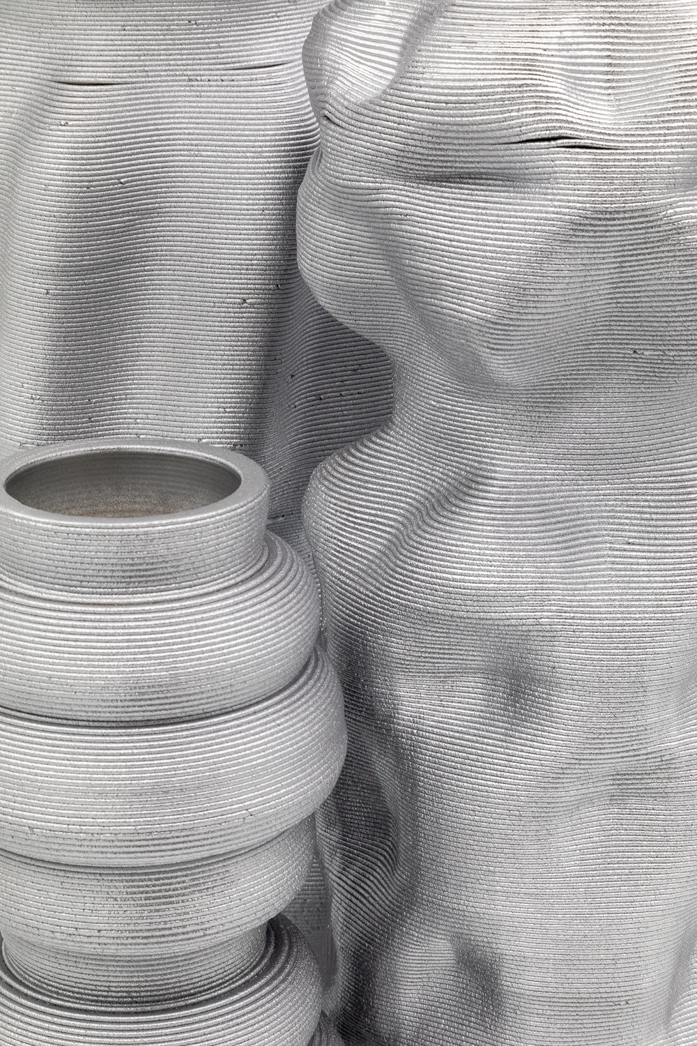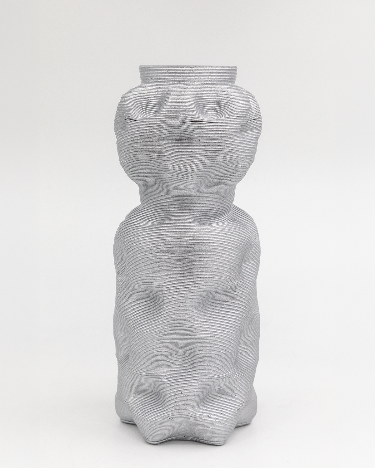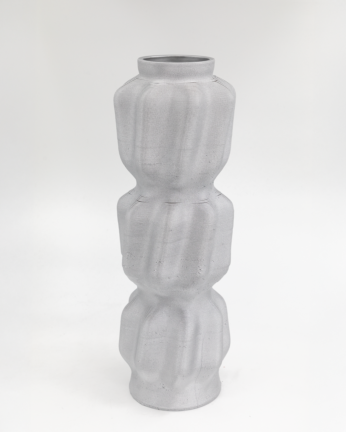 The vases are 3D printed in clay, fired and then spray coated with aluminium. Available in 3 sizes.