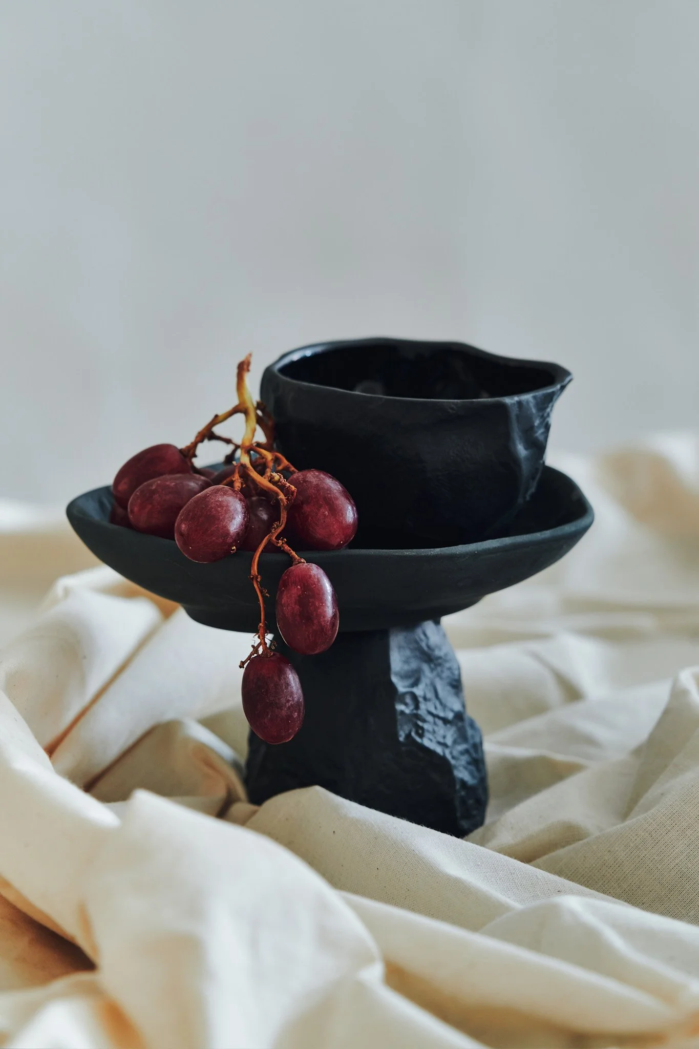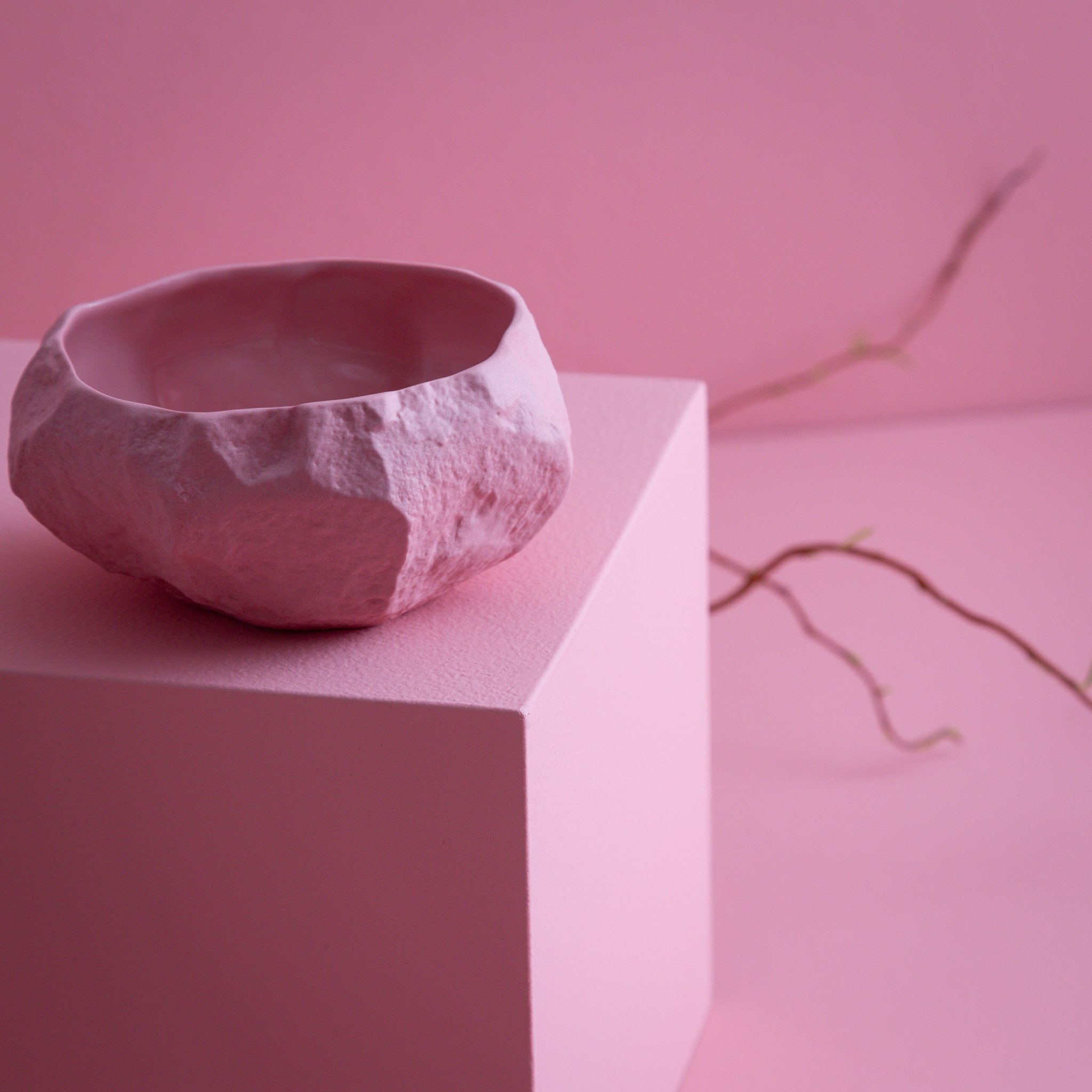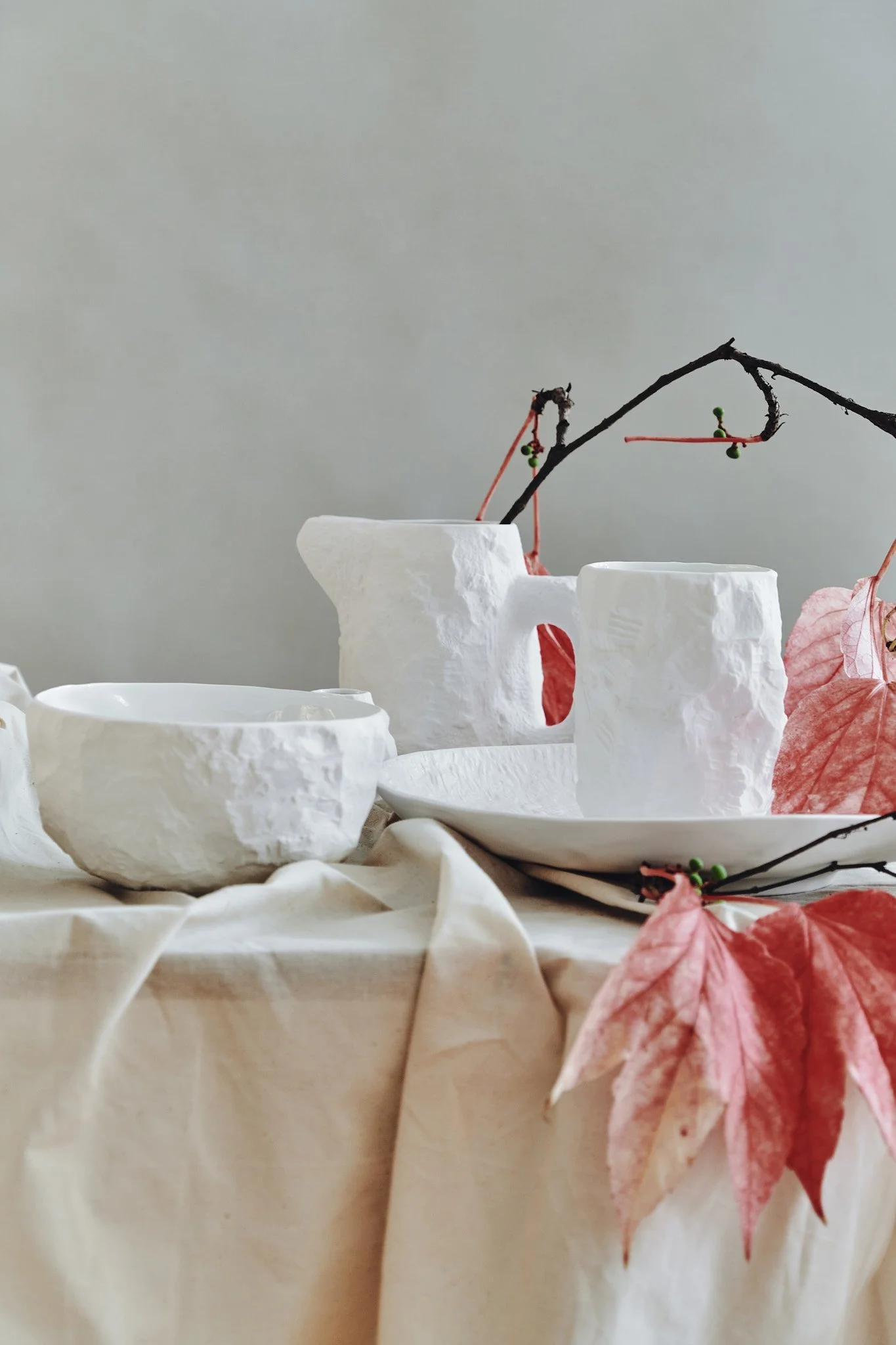Crockery is a collection of fine bone china tableware slip-cast from plaster models carved by hand, with glazed interior for functionality and raw exterior reflecting the modest surface texture of the plaster original.