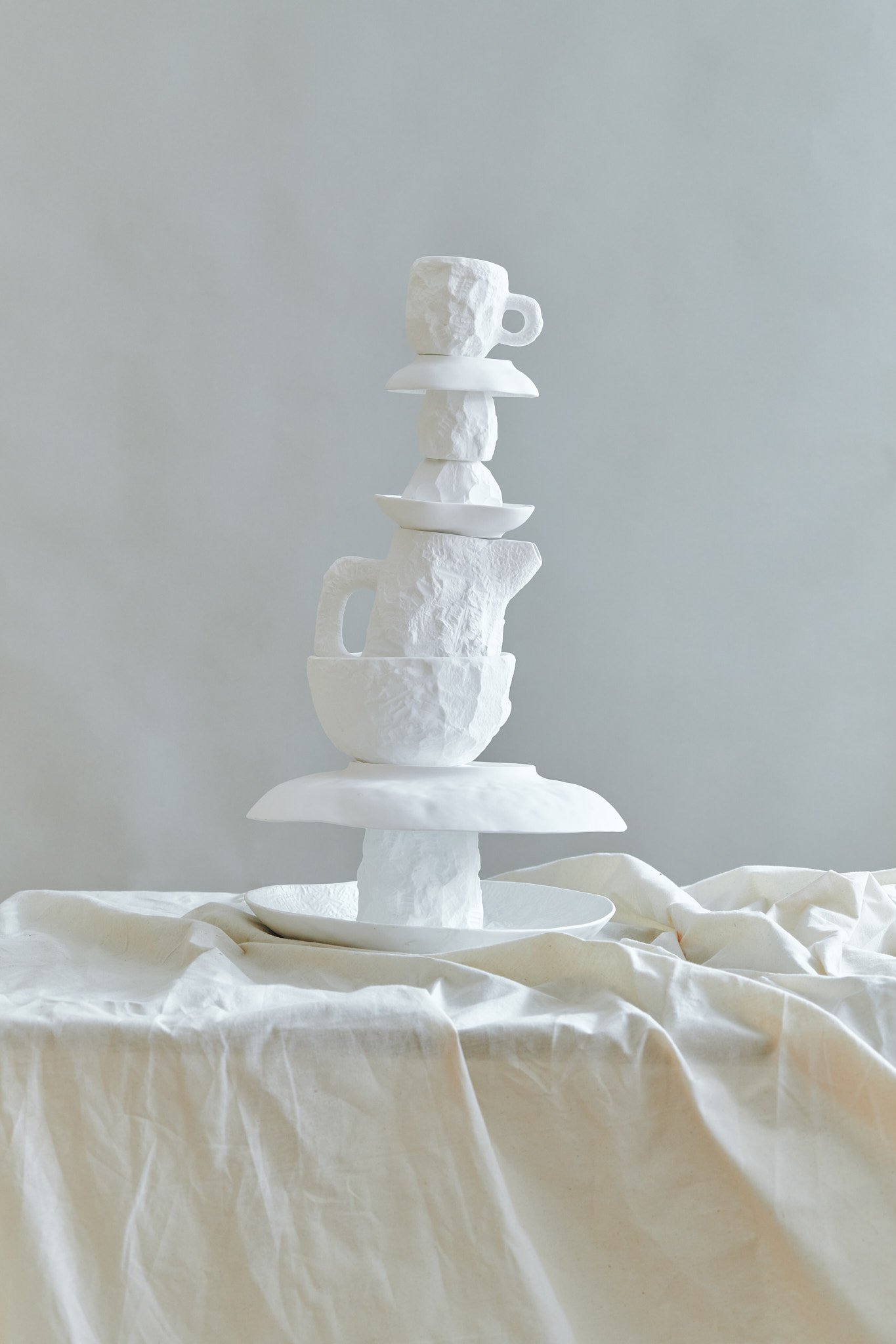 Using the tools of a stonemason Max Lamb chips and carves a solid block of plaster to make a series of tableware, the design of each formed quite simply out of their own making.