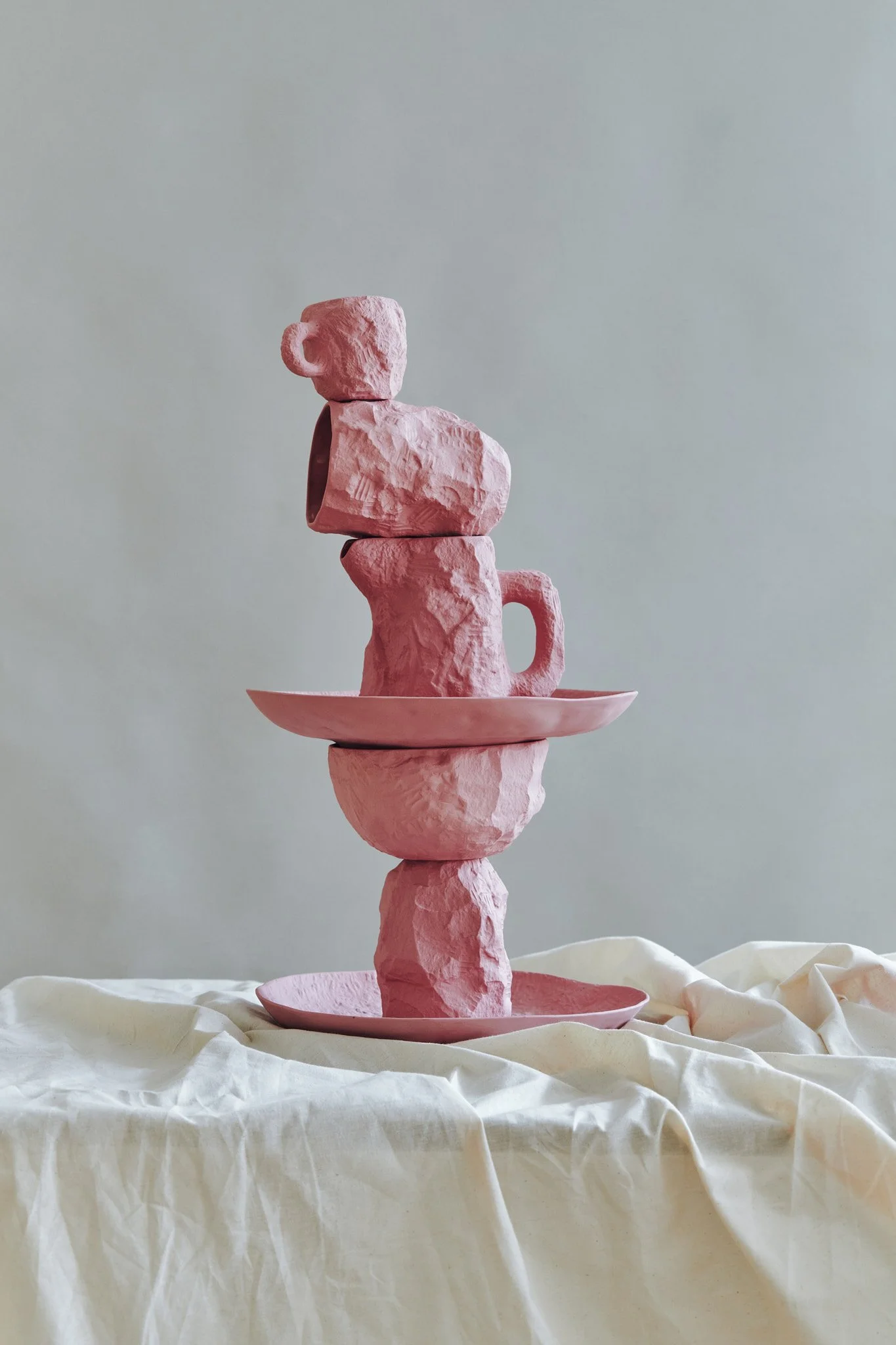 Crockery is a collection of fine bone china tableware slip-cast from plaster models carved by hand, with glazed interior for functionality and raw exterior reflecting the modest surface texture of the plaster original. Using the tools of a stonemason Max Lamb chips and carves a solid block of plaster to make a series of tableware, the design of each formed quite simply out of their own making.